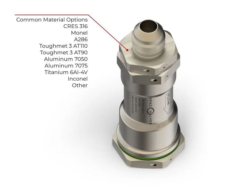 Valves materials can be modified to meet flow media and environmental compatibility. Our team is deeply experienced in oxygen, hydrogen, cryogenic, and hypergolic compatibility.